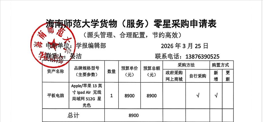 学报编辑部晏老师为开展科研工作,需购置一台电脑,现进行公示,公示期:2026年3月30日至4月1日,如有异议,请致电65883414。
